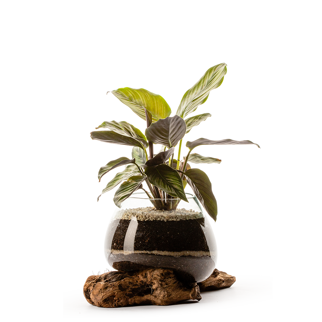 Descubre la esencia de la tranquilidad con nuestra Planta Calathea, magistralmente dispuesta en un terrario de vidrio que reposa sobre una base de madera natural. Las hojas variegadas de la Calathea, con sus patrones de verde oscuro y tonos de plata, ondulan con gracia, aportando un dinamismo suave y una presencia calmante.